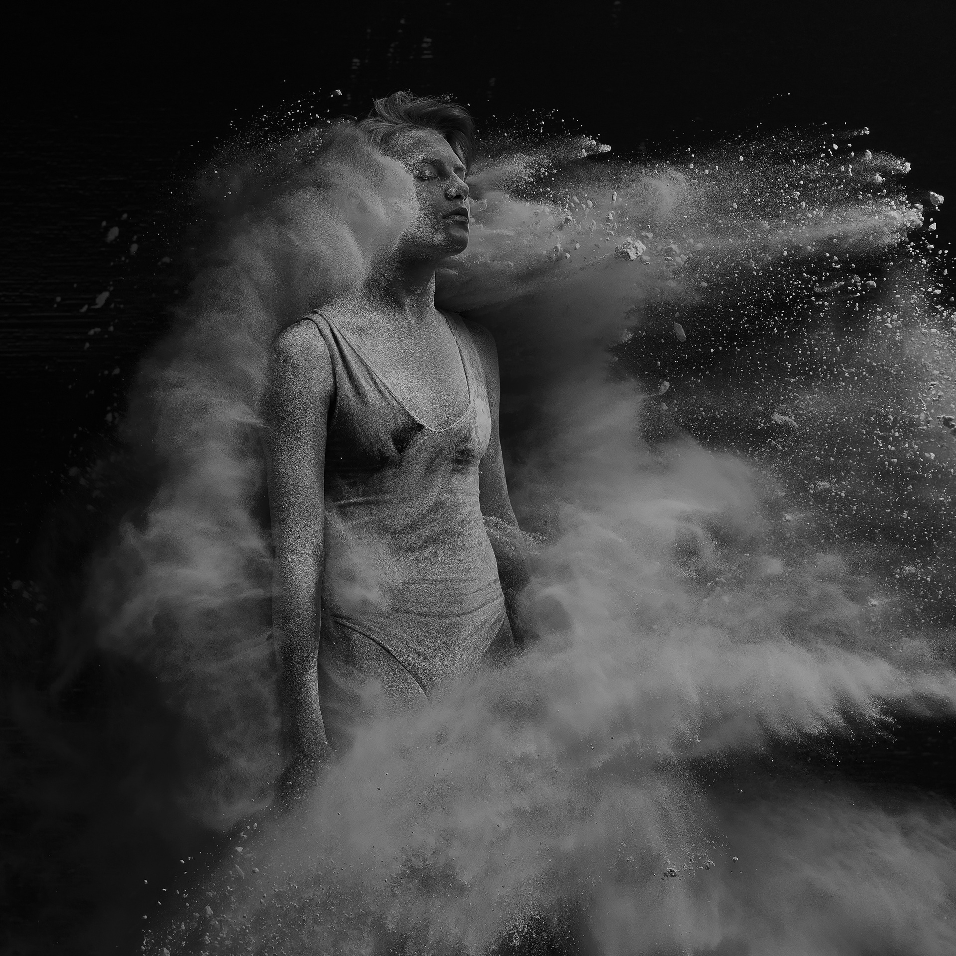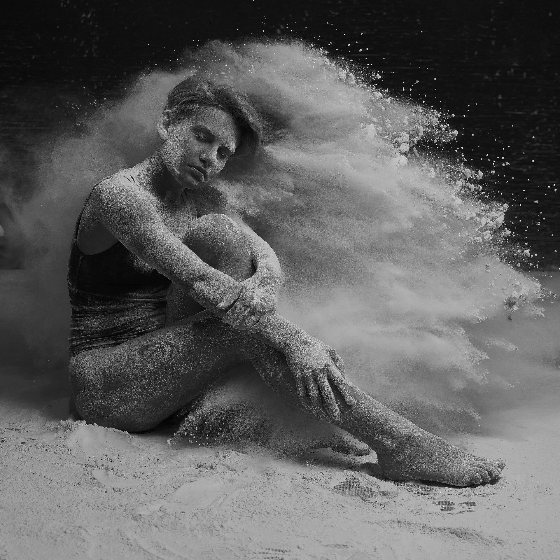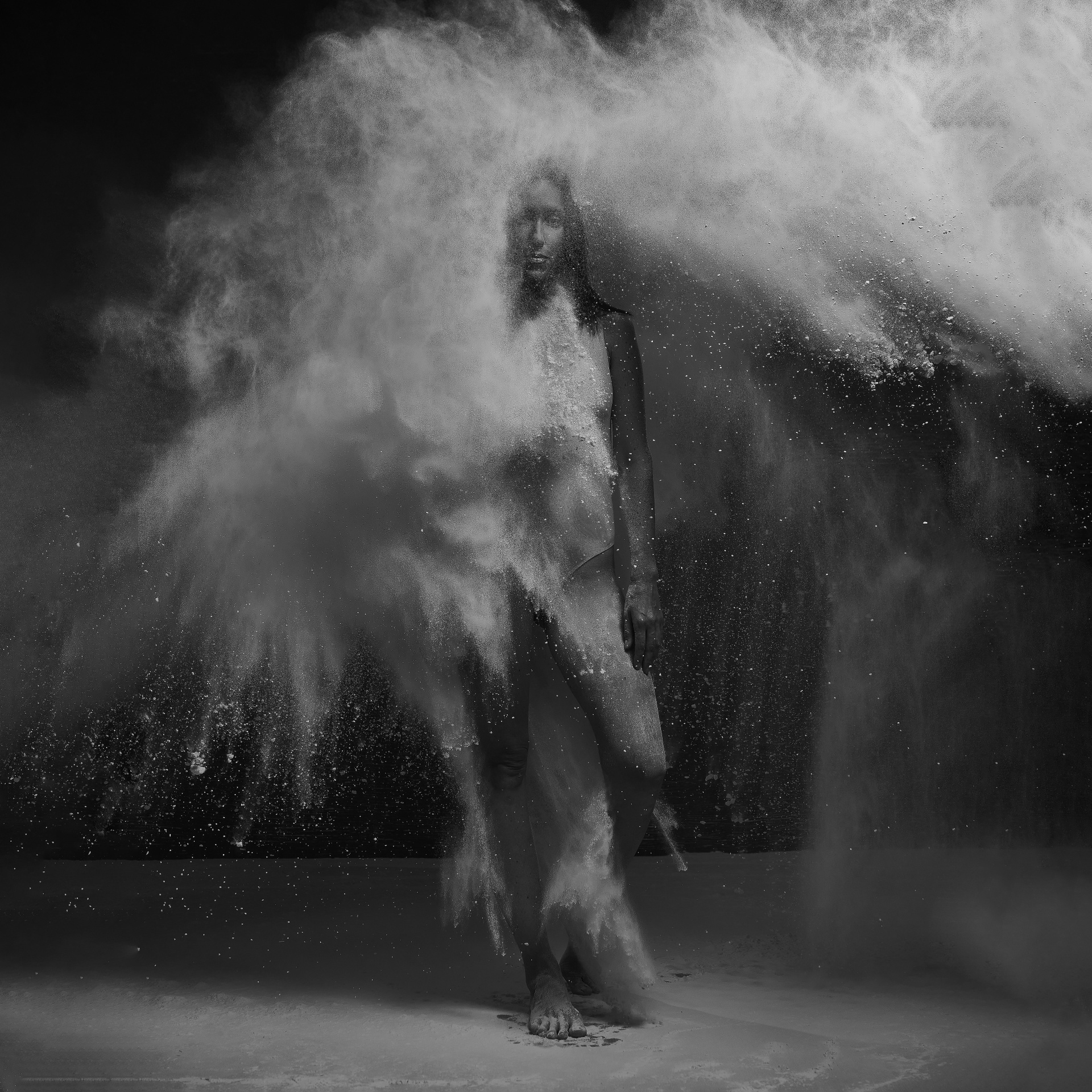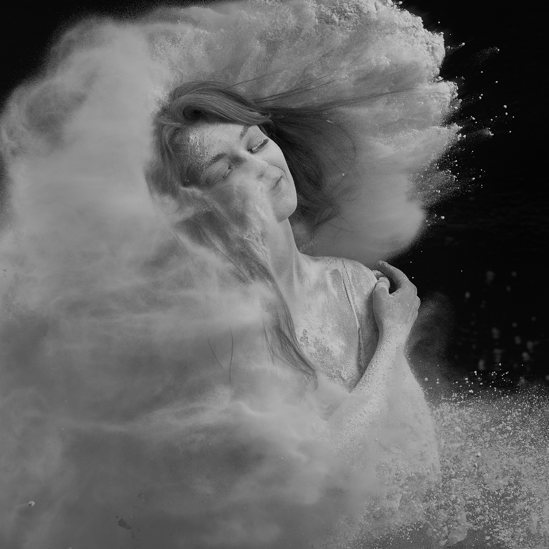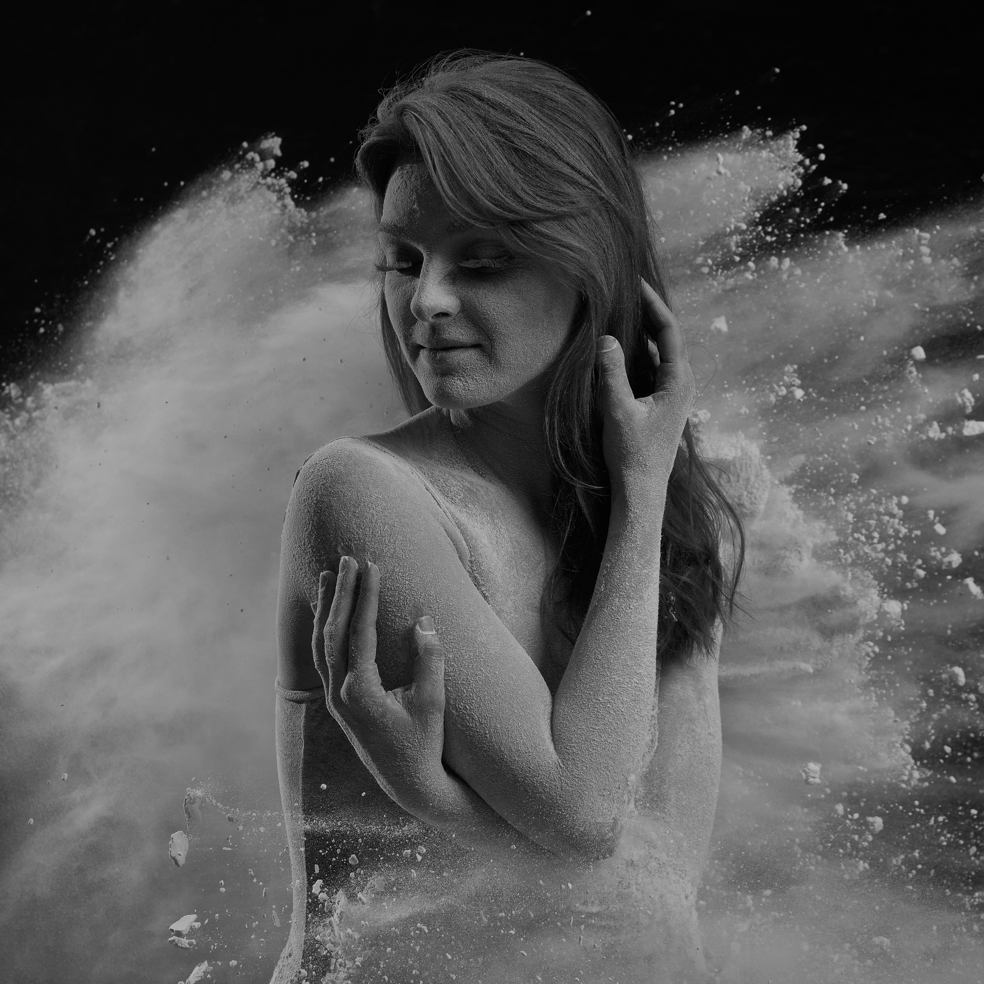 Мука в движении — это облако, лишенное веса и формы. В этой серии аморфизм проявляется через фактуру. Взрыв белого порошка на мгновение создает вокруг модели новую «плоть», которая рассыпается быстрее, чем глаз успевает ее осознать. Фотография превращает это эфемерное облако в твердый, почти скульптурный объект. Мы видим не пыль, а застывшую энергию распада и созидания одновременно.