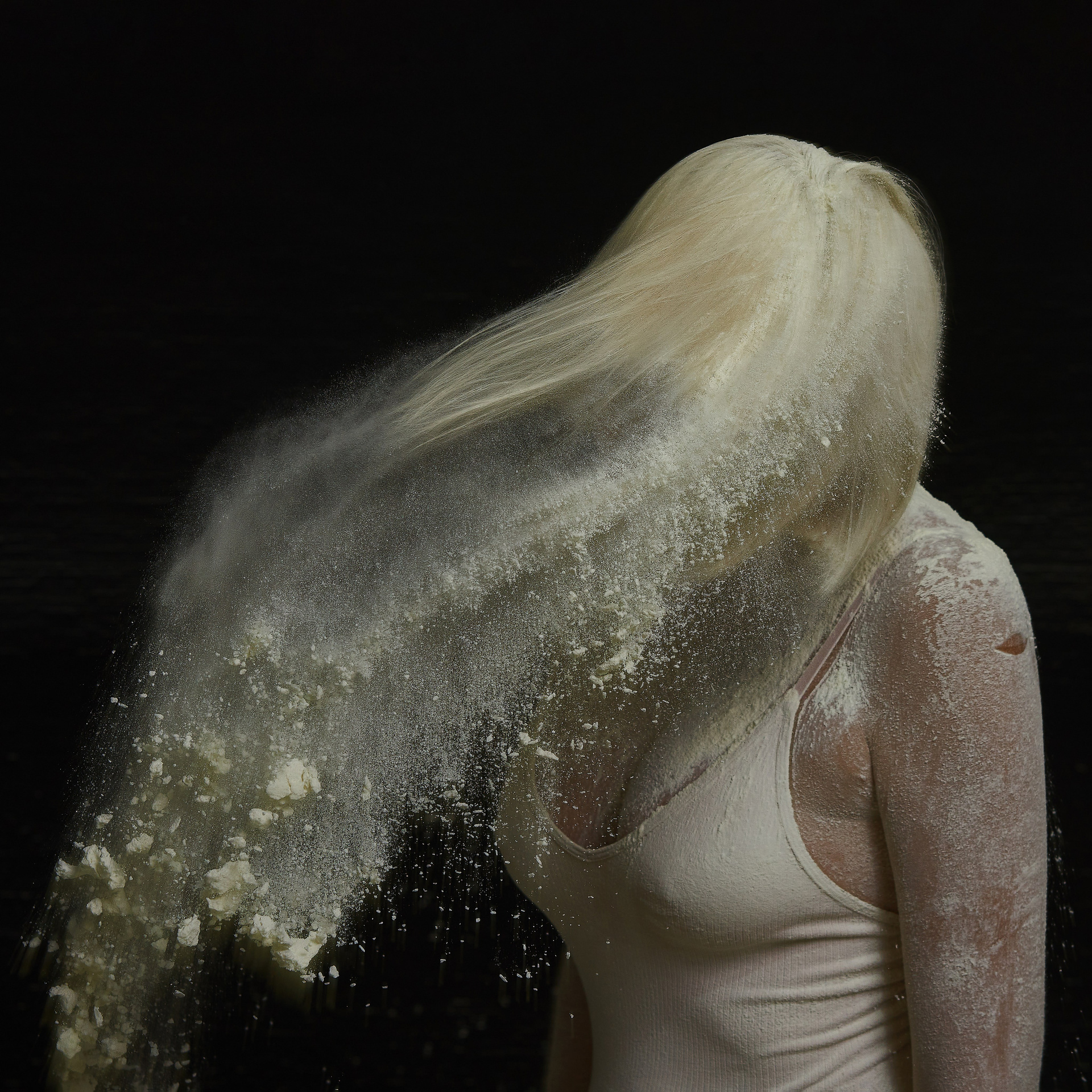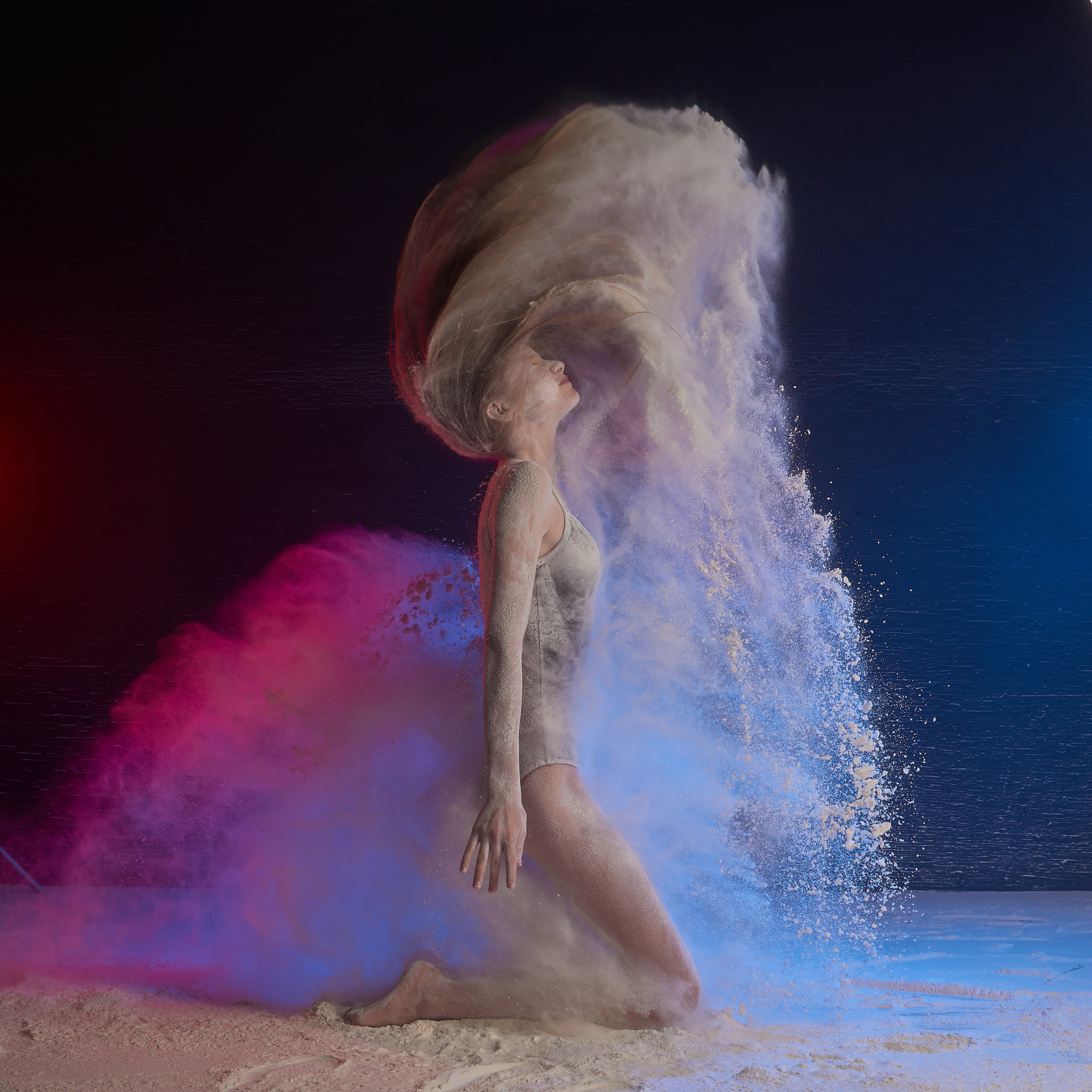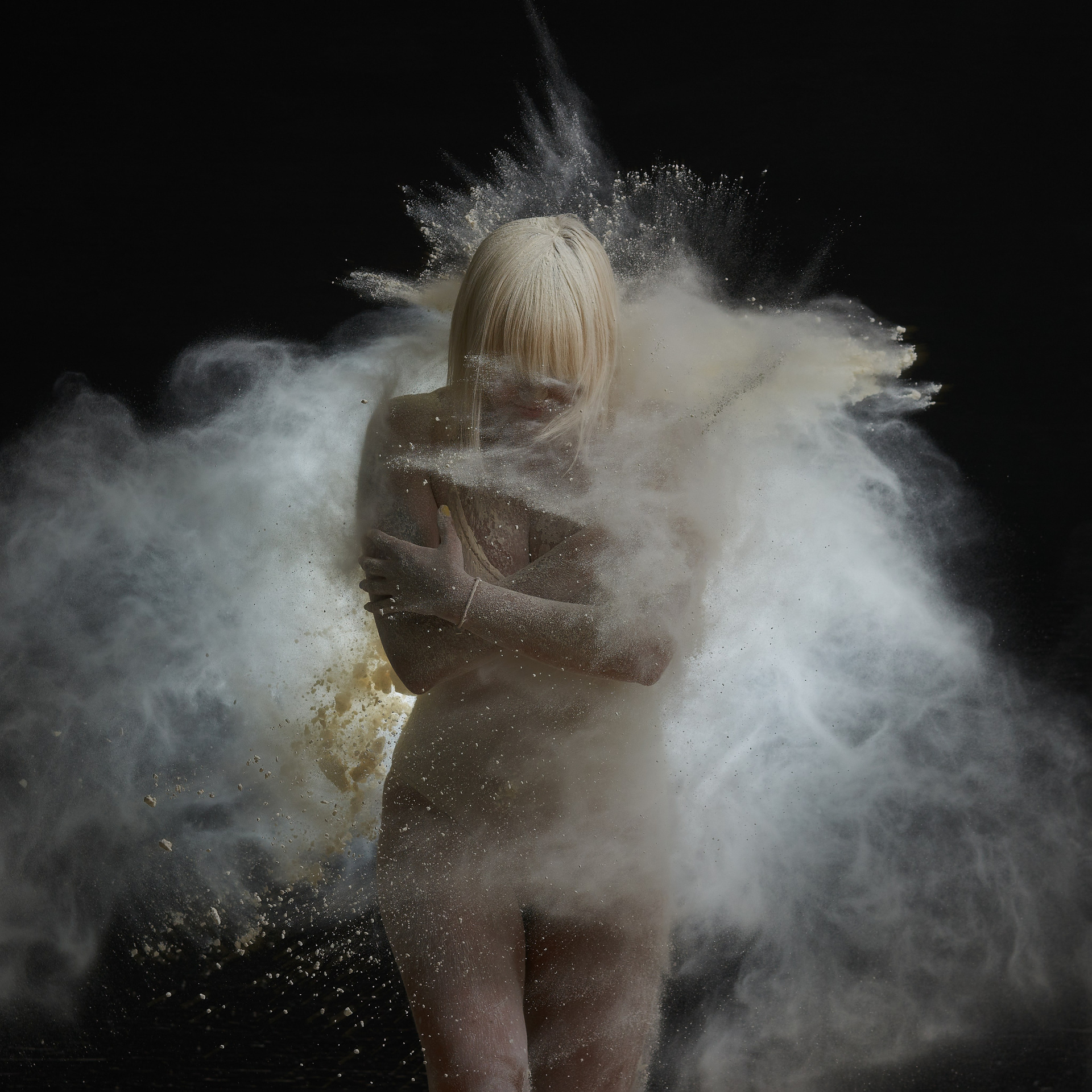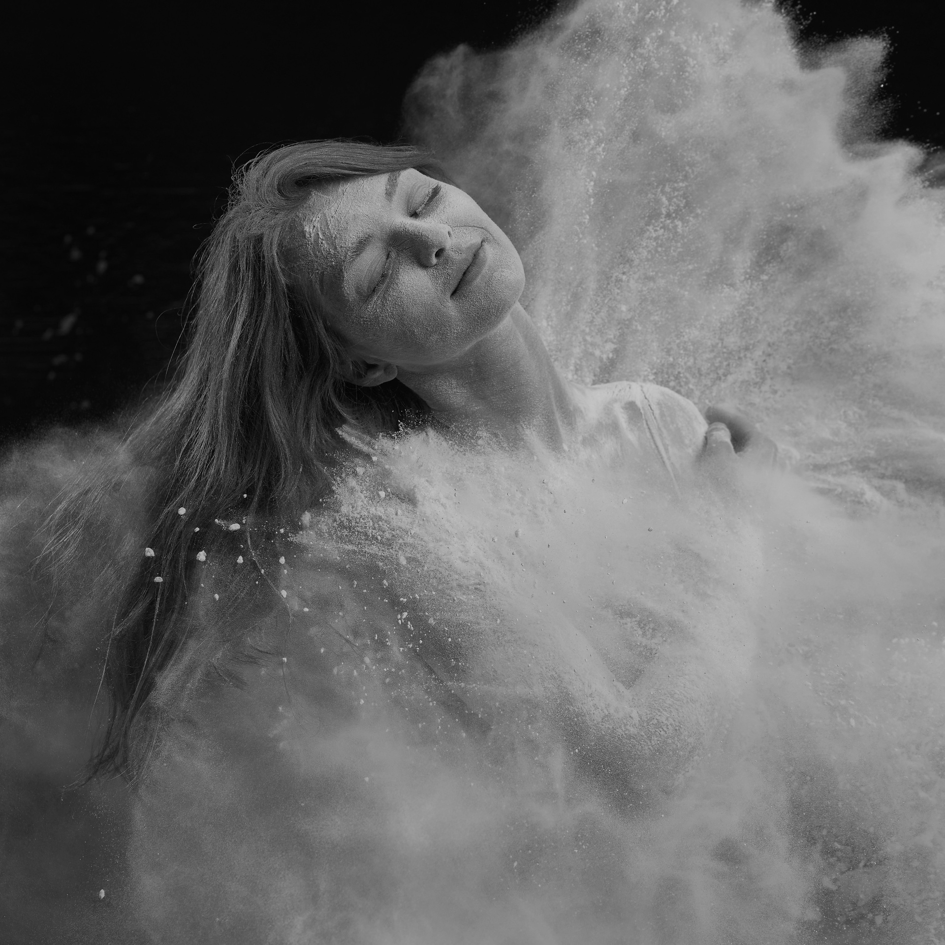 Мука в движении — это облако, лишенное веса и формы. В этой серии аморфизм проявляется через фактуру. Взрыв белого порошка на мгновение создает вокруг модели новую «плоть», которая рассыпается быстрее, чем глаз успевает ее осознать. Фотография превращает это эфемерное облако в твердый, почти скульптурный объект. Мы видим не пыль, а застывшую энергию распада и созидания одновременно.