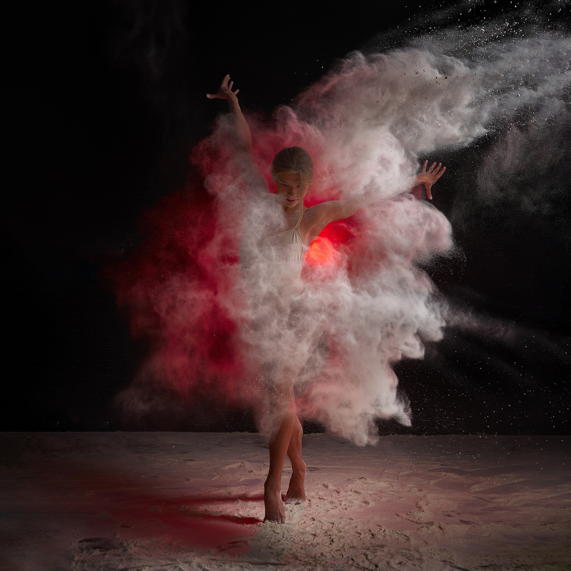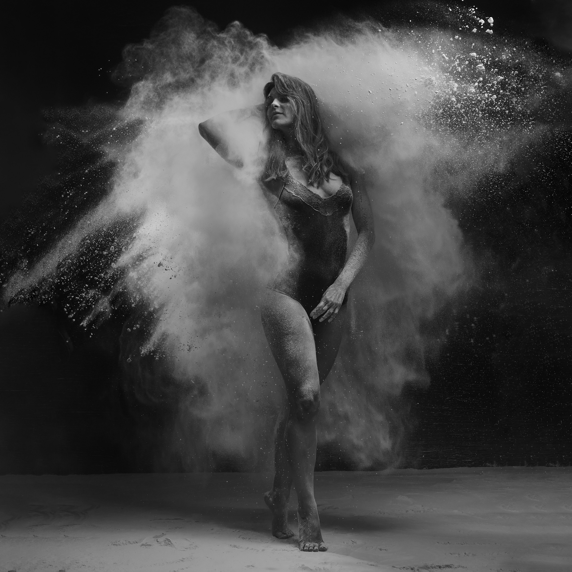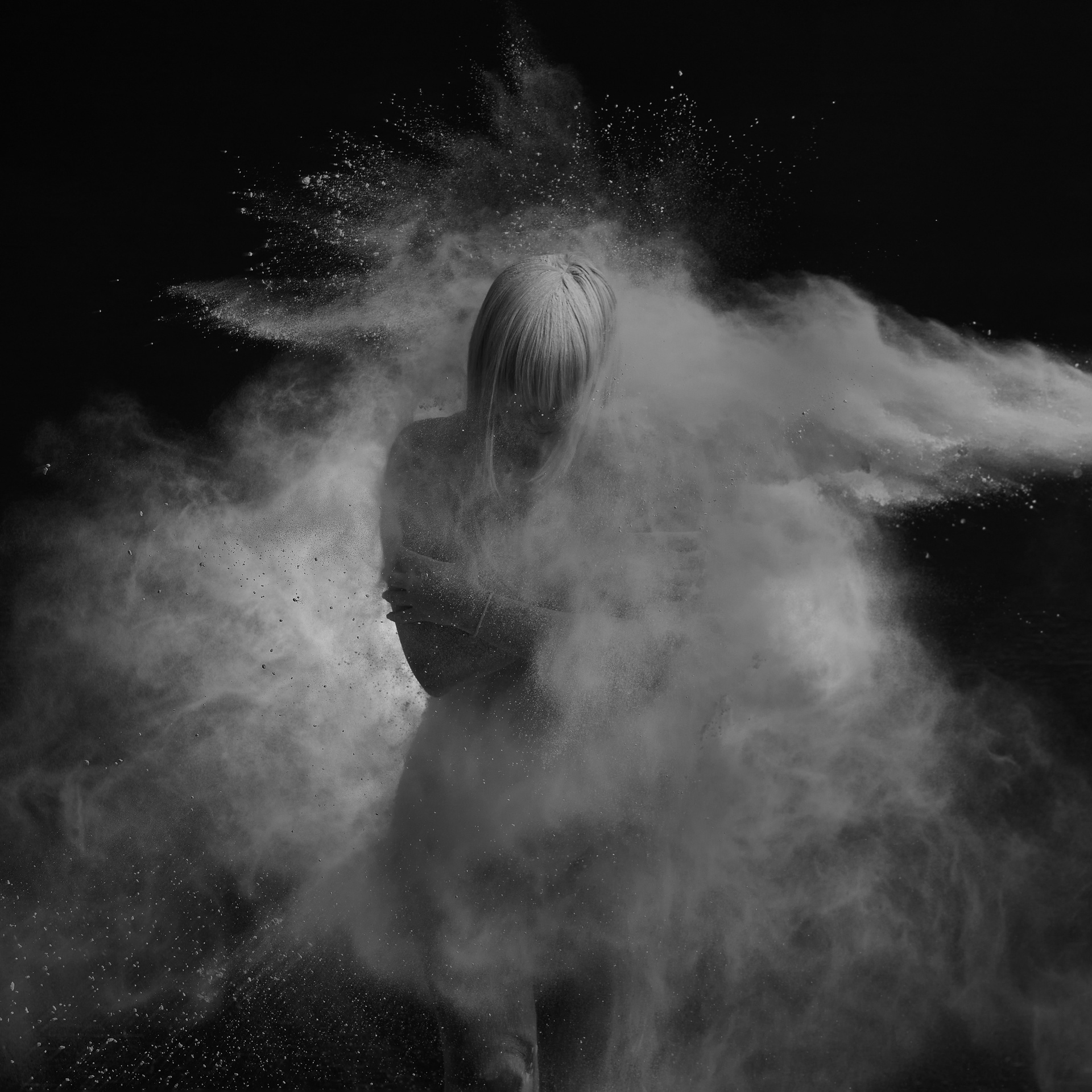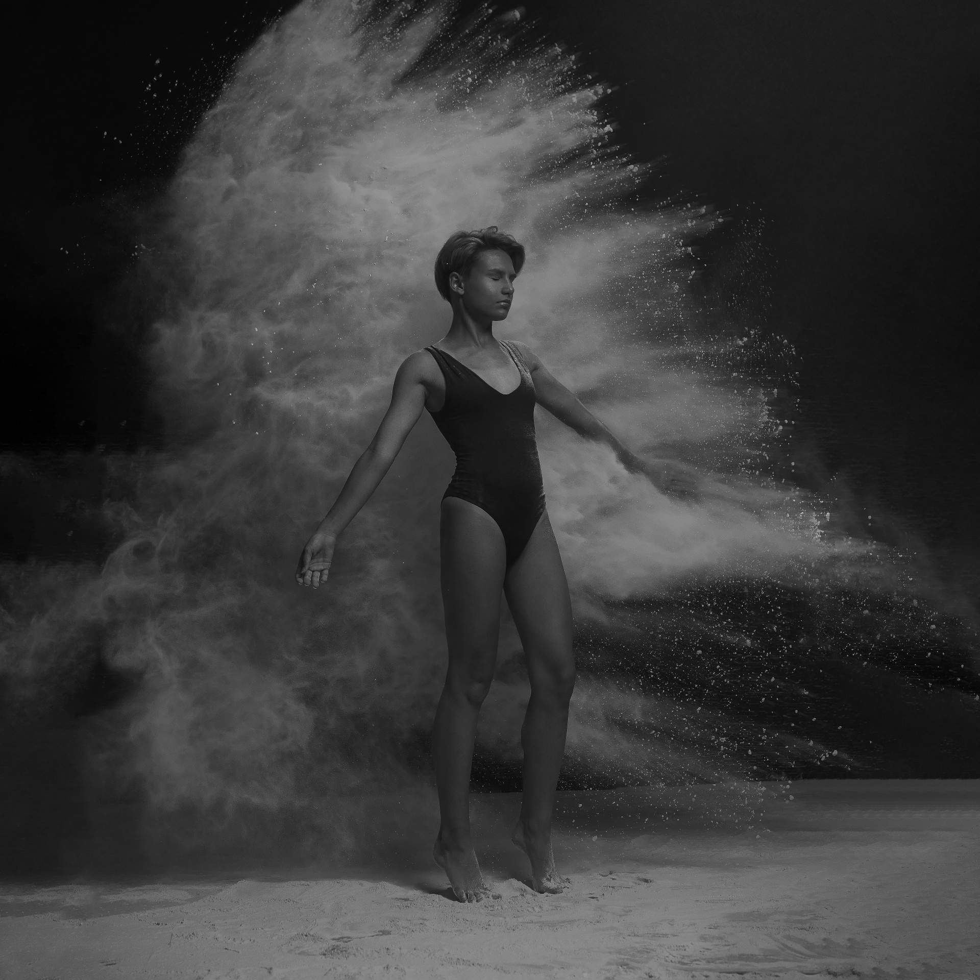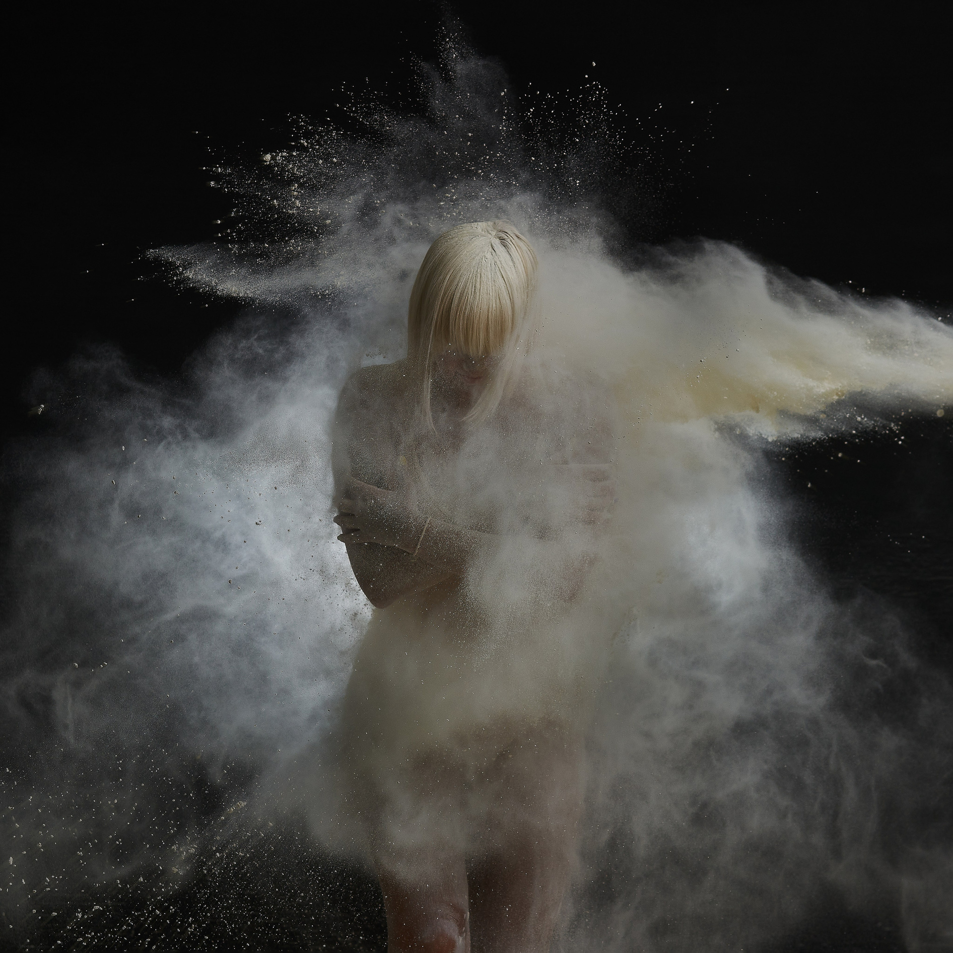 Мука в движении — это облако, лишенное веса и формы. В этой серии аморфизм проявляется через фактуру. Взрыв белого порошка на мгновение создает вокруг модели новую «плоть», которая рассыпается быстрее, чем глаз успевает ее осознать. Фотография превращает это эфемерное облако в твердый, почти скульптурный объект. Мы видим не пыль, а застывшую энергию распада и созидания одновременно.