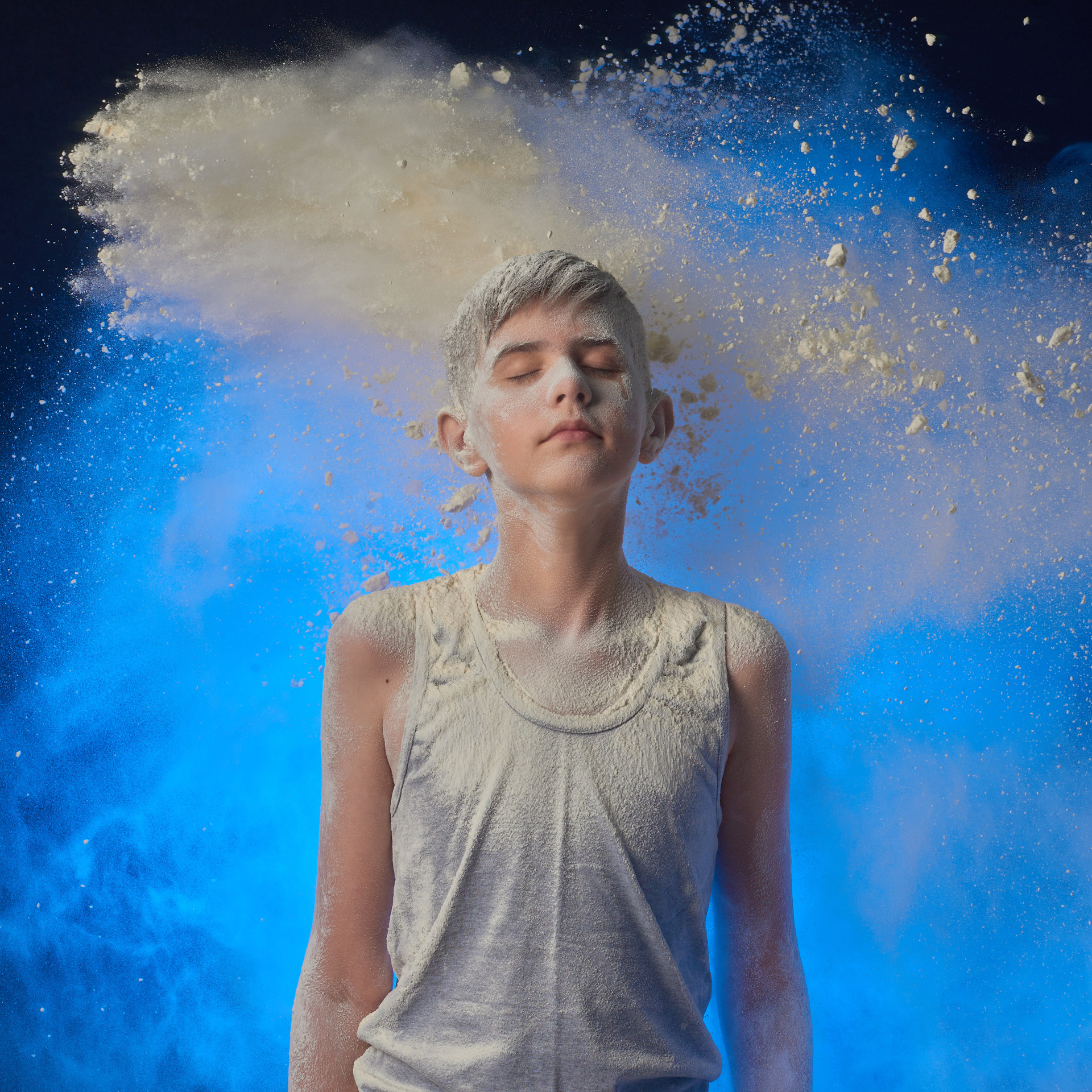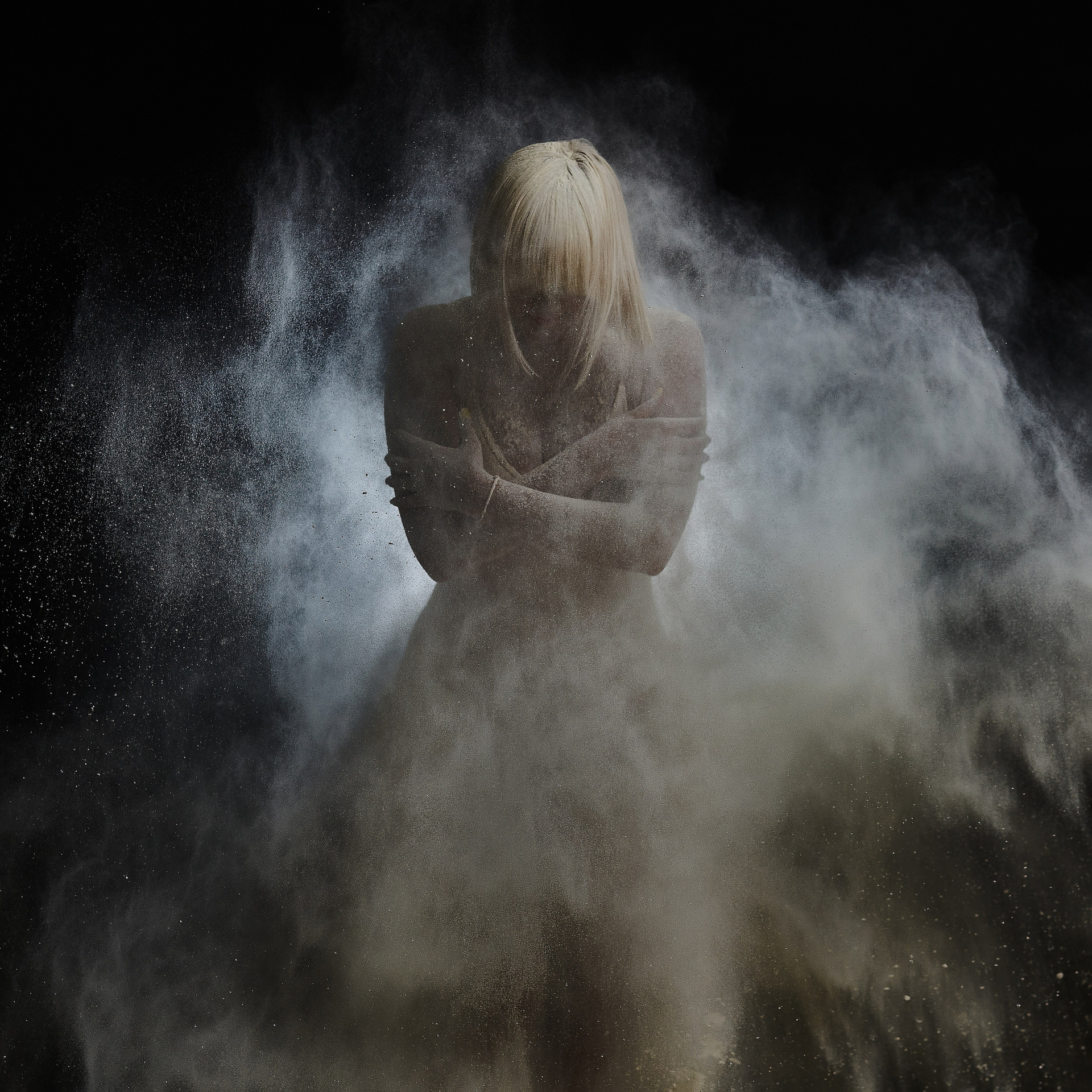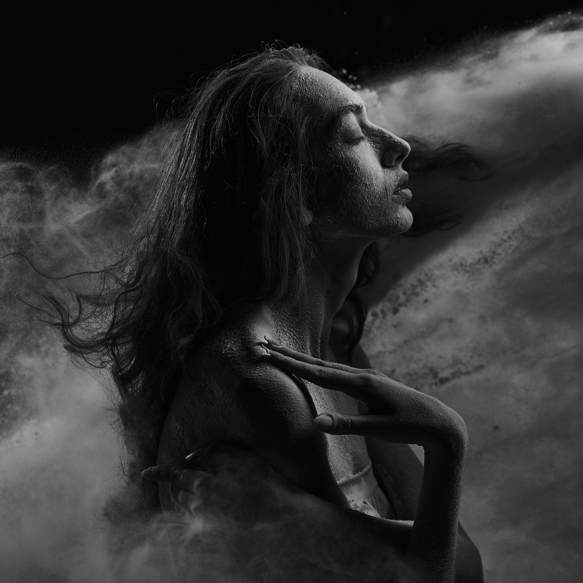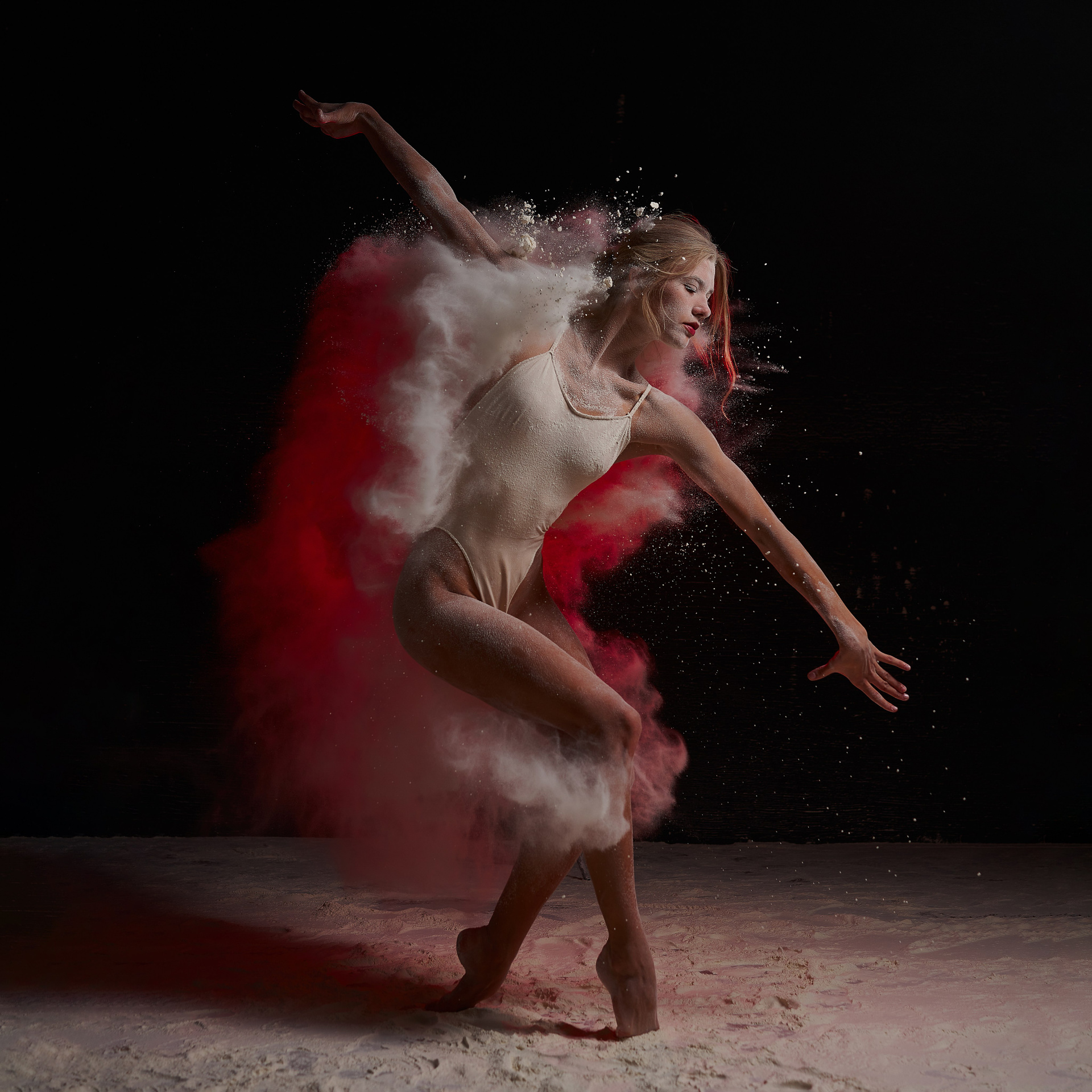 Мука в движении — это облако, лишенное веса и формы. В этой серии аморфизм проявляется через фактуру. Взрыв белого порошка на мгновение создает вокруг модели новую «плоть», которая рассыпается быстрее, чем глаз успевает ее осознать. Фотография превращает это эфемерное облако в твердый, почти скульптурный объект. Мы видим не пыль, а застывшую энергию распада и созидания одновременно.