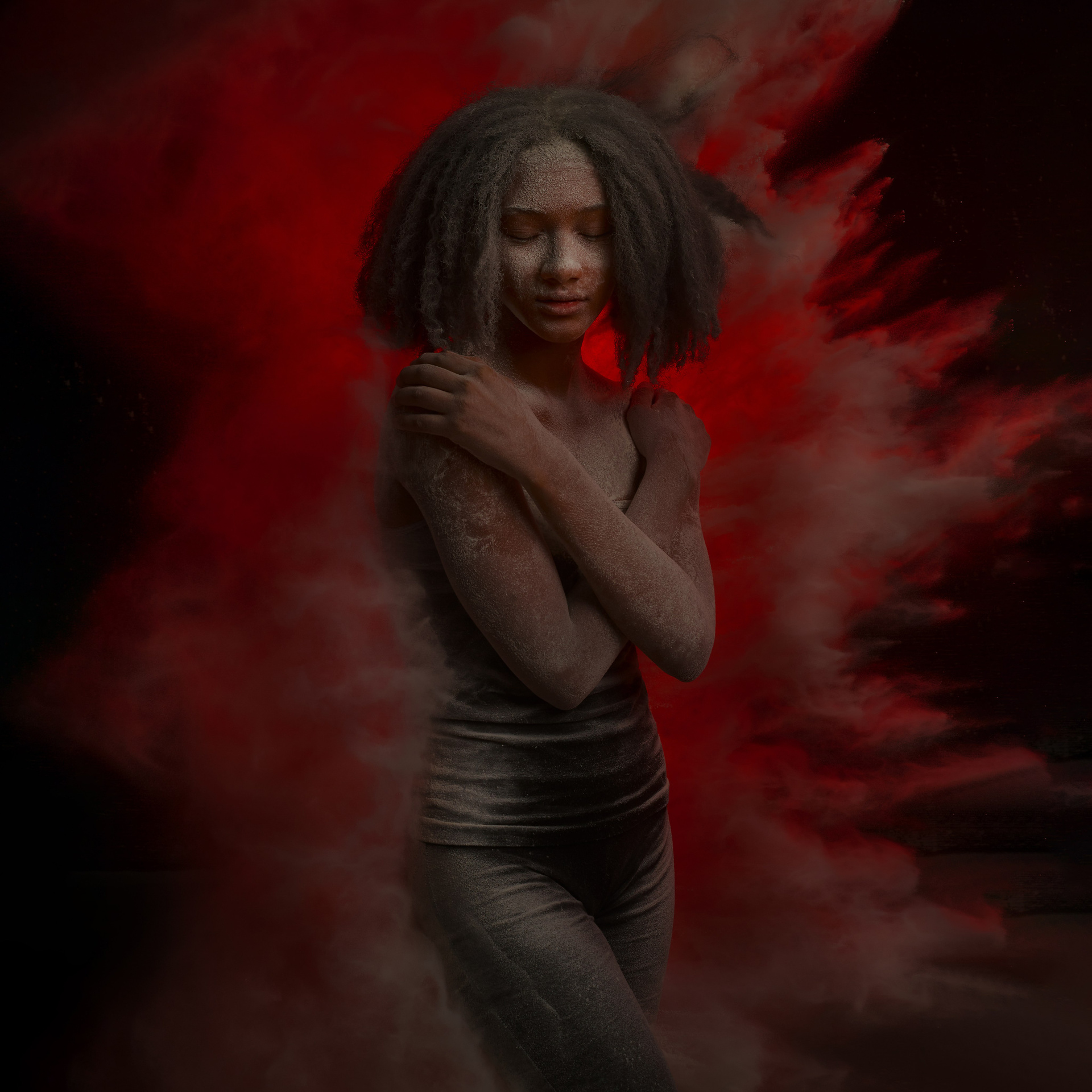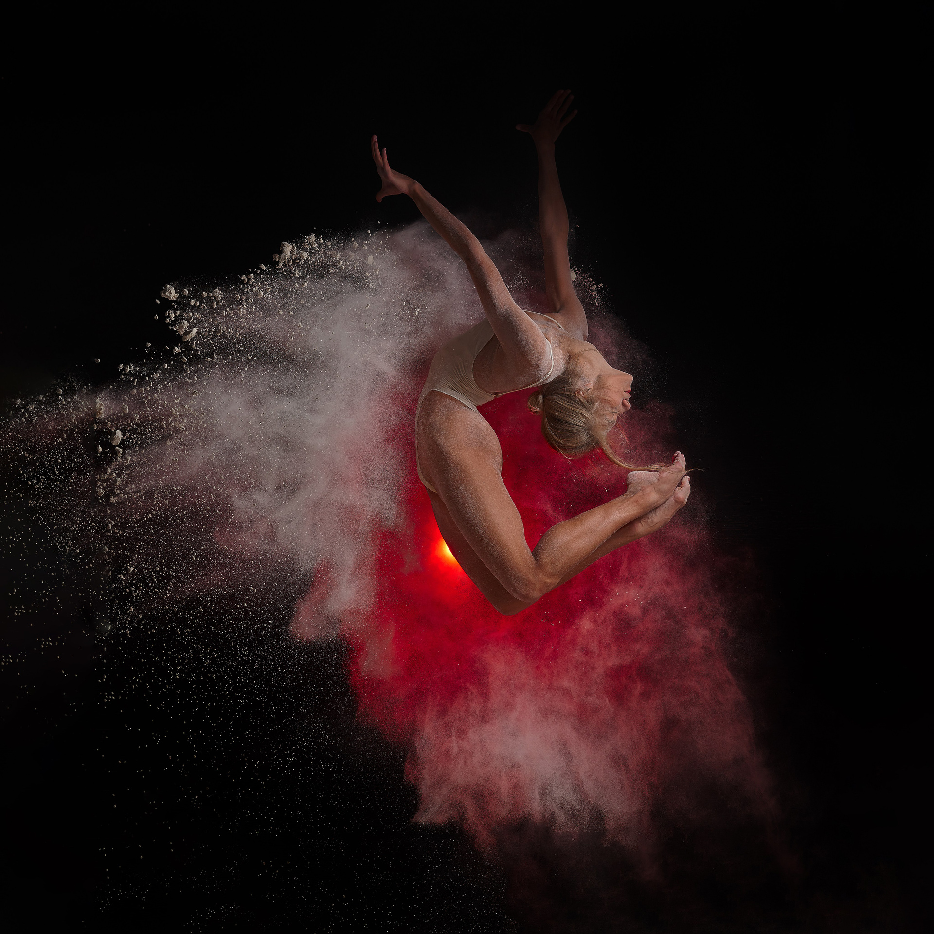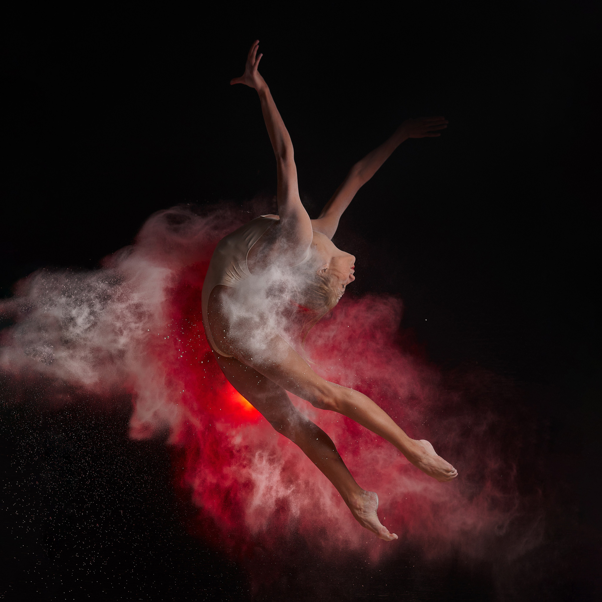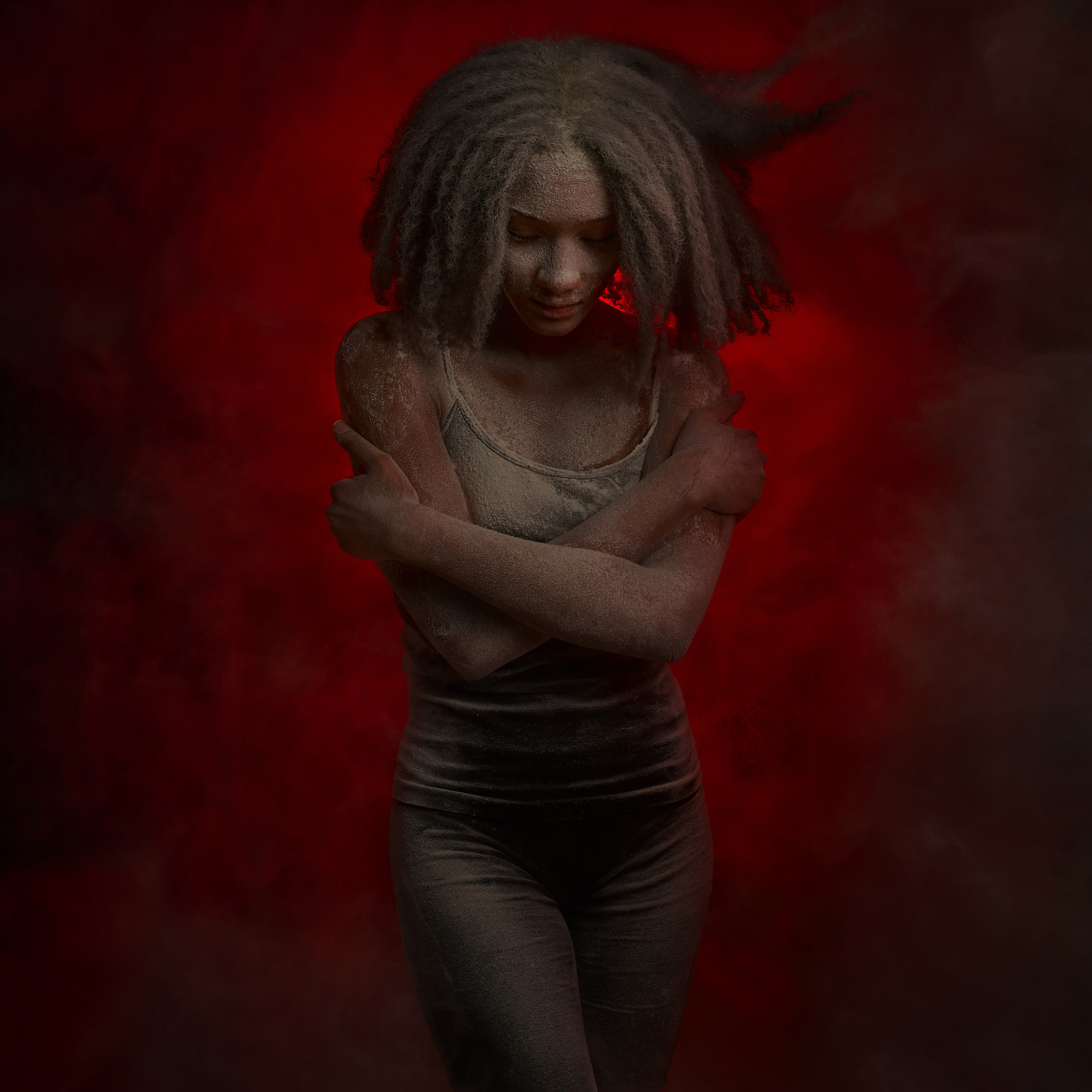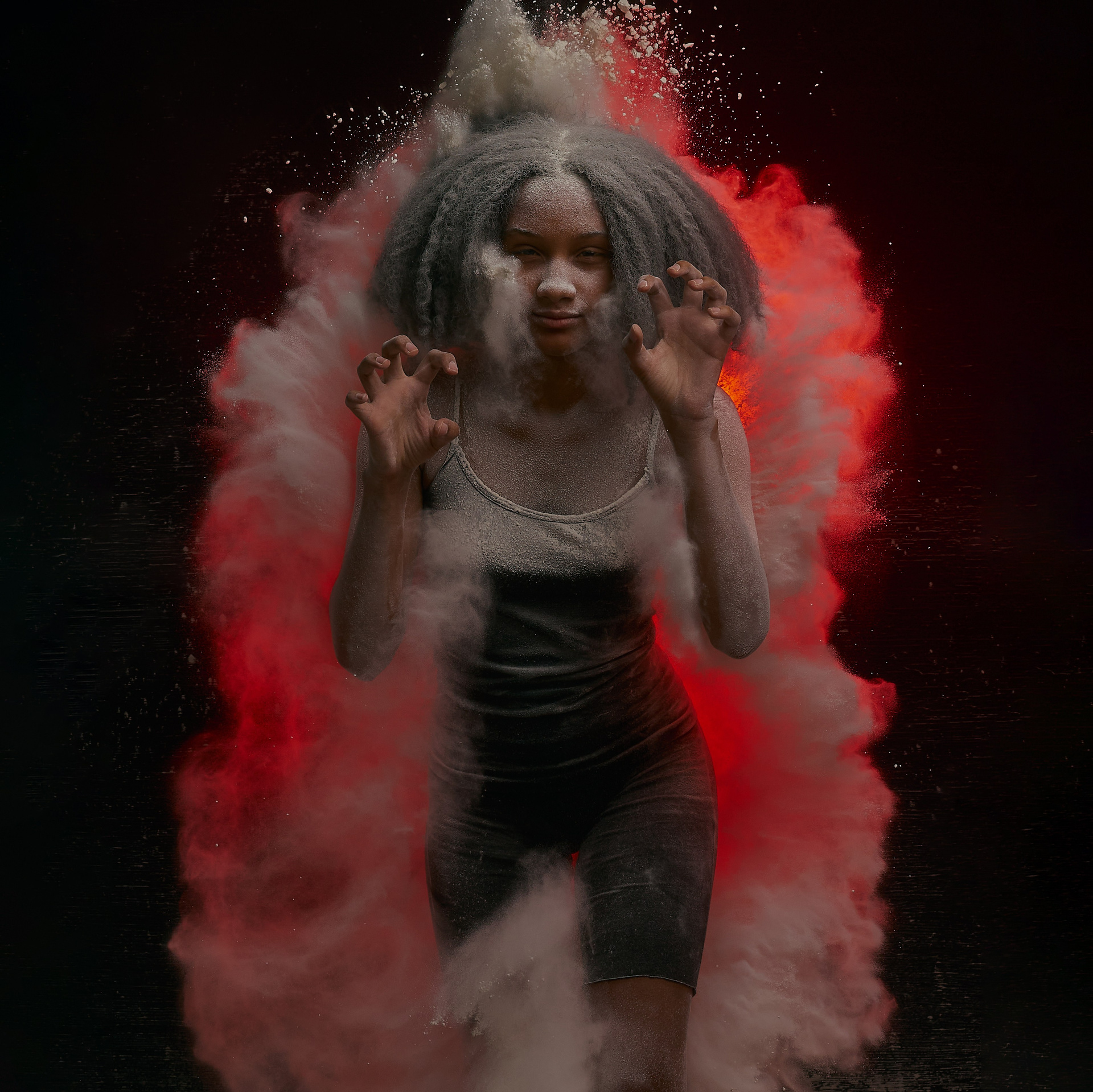 Мука в движении — это облако, лишенное веса и формы. В этой серии аморфизм проявляется через фактуру. Взрыв белого порошка на мгновение создает вокруг модели новую «плоть», которая рассыпается быстрее, чем глаз успевает ее осознать. Фотография превращает это эфемерное облако в твердый, почти скульптурный объект. Мы видим не пыль, а застывшую энергию распада и созидания одновременно.