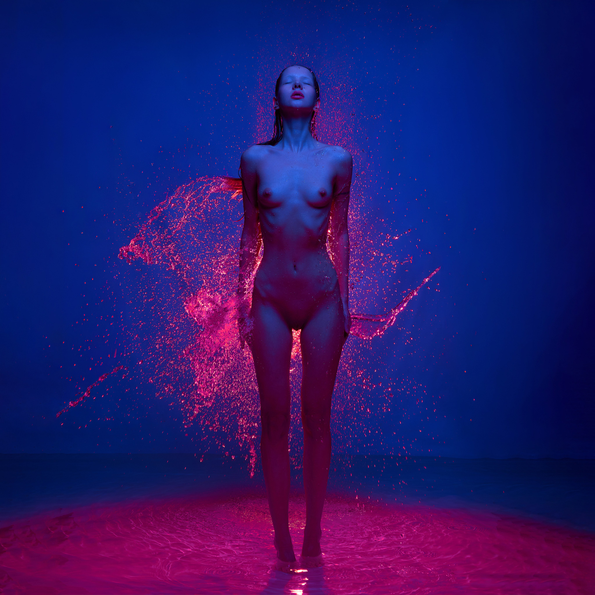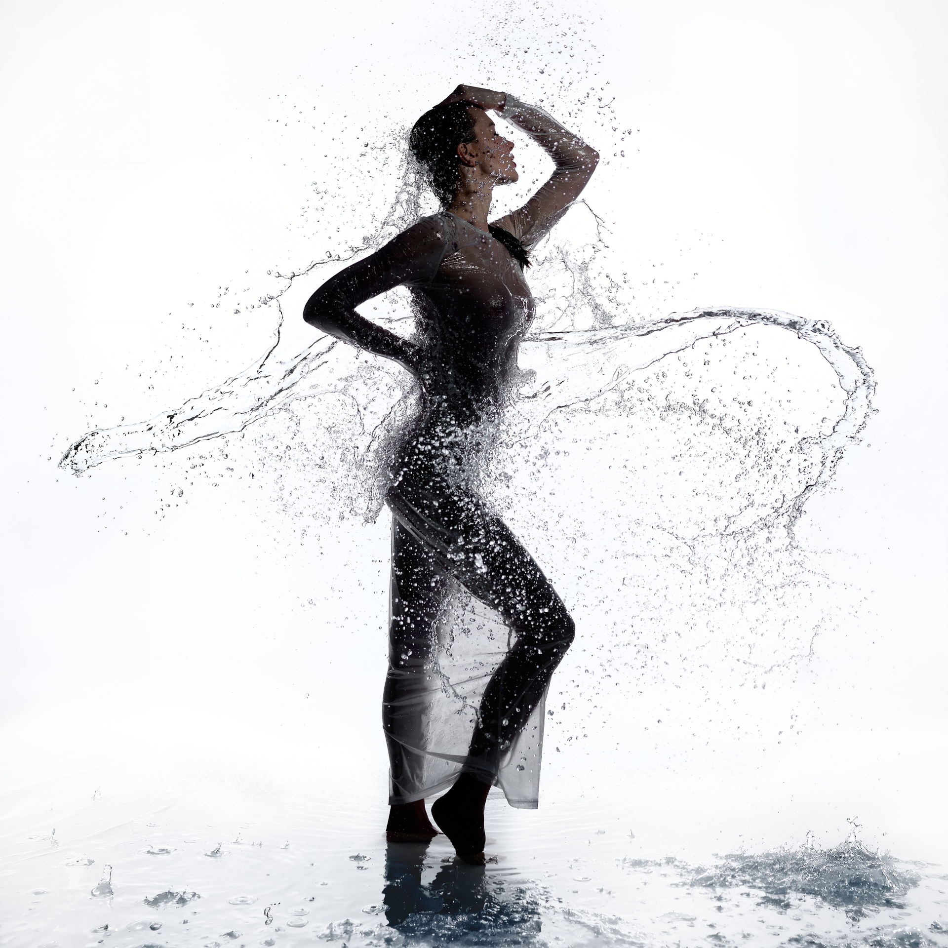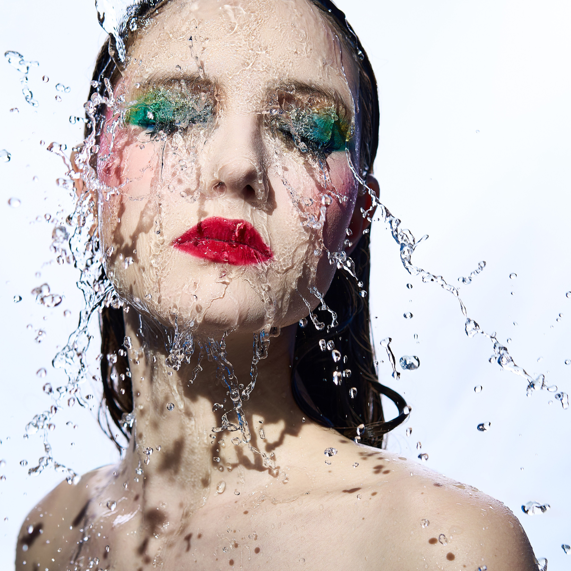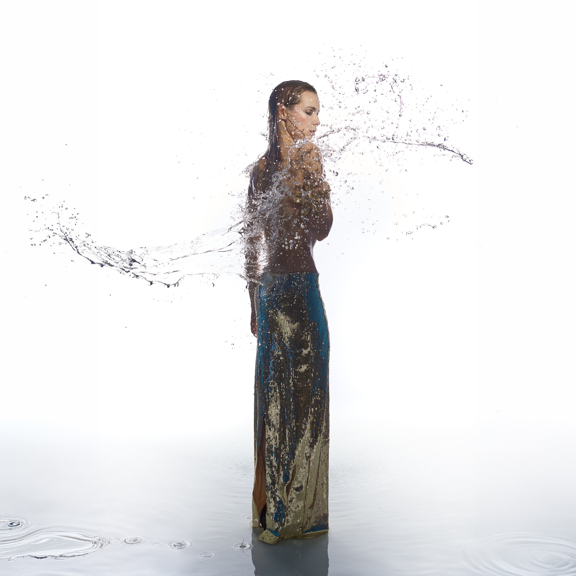 Вода — идеальный пример «застывшей жидкости». В момент всплеска она обретает резкие, острые грани, напоминающие битое стекло или прозрачный камень. В этой серии аморфизм достигает своего пика: текучесть становится статикой. Мы видим каждую каплю как отдельный замерший мир, который в реальности существовал лишь сотую долю секунды. Это попытка остановить океан в одном жесте.